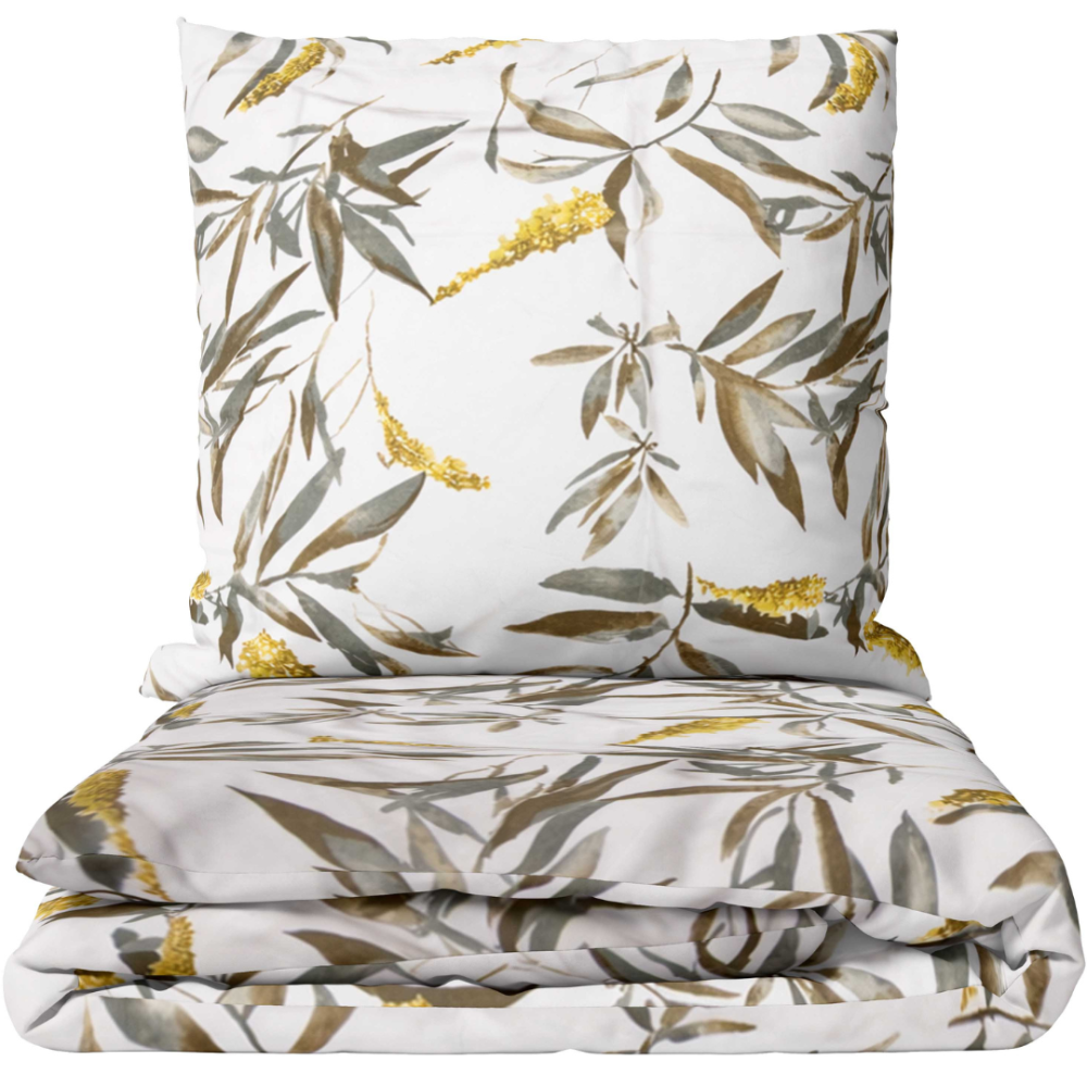Helles Bettwäsche-Set mit olivfarbenem Blattdesign. Der nahezu weiße Grund wird von grünlich-braunen Blättern und warmen gelblichen Akzenten geschmückt. Die naturnahe Farbgestaltung vermittelt Leichtigkeit und eine ruhige, ausgewogene Optik im Stil botanischer Zeichnungen. Das Muster wirkt fein und unaufdringlich und sorgt für ein elegantes Gesamtbild. Besonders stimmig ist dieses Design in naturverbundenen oder schlichten Raumkonzepten.